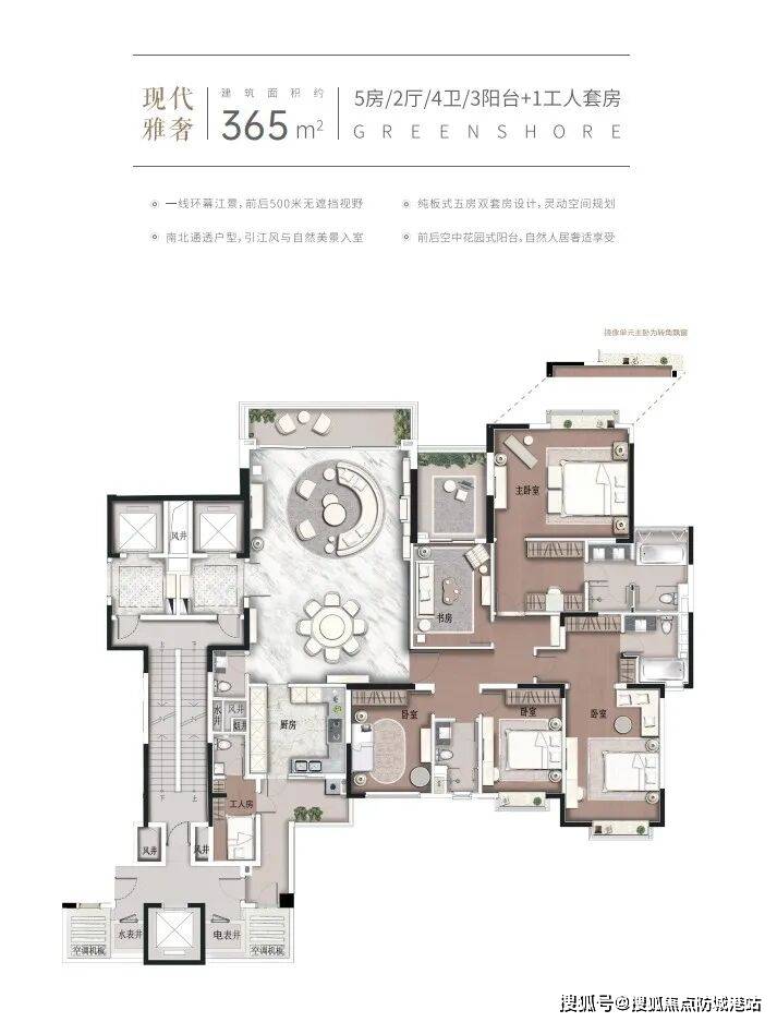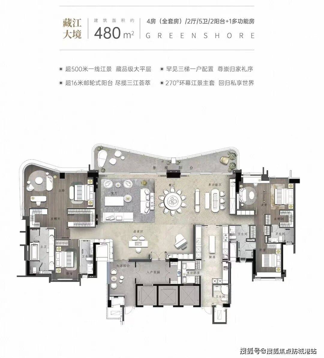 南天名苑主推140-250㎡环幕江景大平层和超大平层住宅,户型设计兼顾私密性与奢华感。『天启』组团住宅为约140-250㎡四房双套房设计,配备专梯专户,实现极致私密体验。『悦岛』组团约365㎡大平层,五房双套房布局,客厅、阳台与江景无缝衔接,南北通透,全明户型,客厅奢阔达6.8米。湾流组团更是罕见的480㎡天幕大平层,四房双套房+多功能房设计,超500米江景视野、16米宽阔阳台,结合国际顶级建材及梁志天室内设计,打造顶级豪宅典范。户型充分利用江景资源,室内空间布局合理,兼顾家居舒适性与尊崇体验。