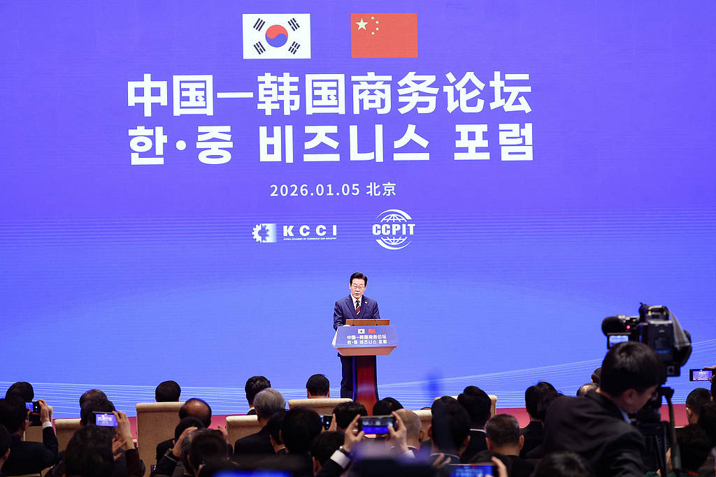 2026年1月5日,北京,韩国总统李在明出席中国—韩国商务论坛。视觉中国 图